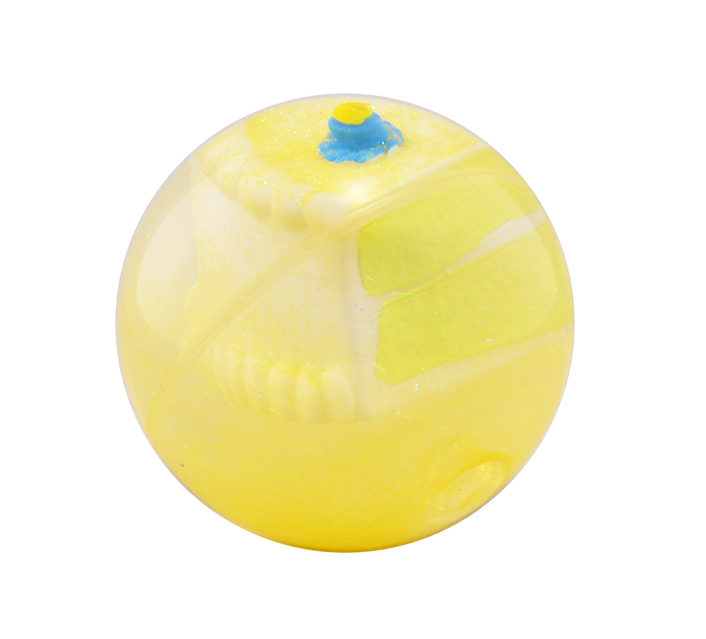 Прозрачный мячик из силикона. Внутри мяча вода, плавает кусочек тортика и блестки.