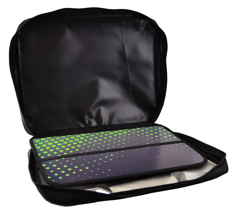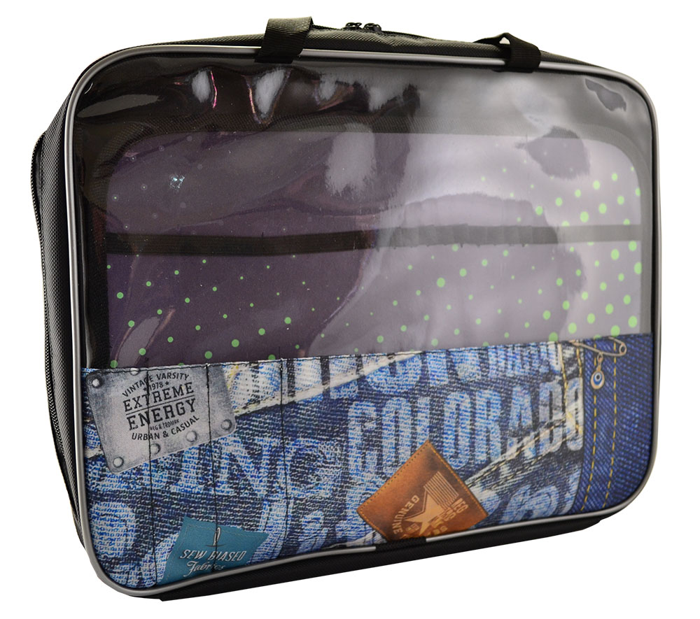 - комбинированная лицевая сторона: мягкий, прозрачный пластик с рисунком на ткани в нижней части