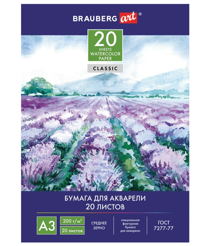 Папка для акварели А3, 20 листов BRAUBERG ART CLASSIC, "Долина" 200 г/кв.м