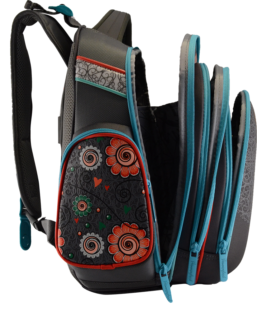 - три больших отделения на молниях. В основном, самом большом отделении расположены жесткие перемычки- вставки, для комфортного размещения тетрадей или учебников. В переднем отделении предусмотрен органайзер с карманом для мобильного телефона, сетчатым карманом для мелочей, отделениями для ручек и карандашей, подвеской для ключей;