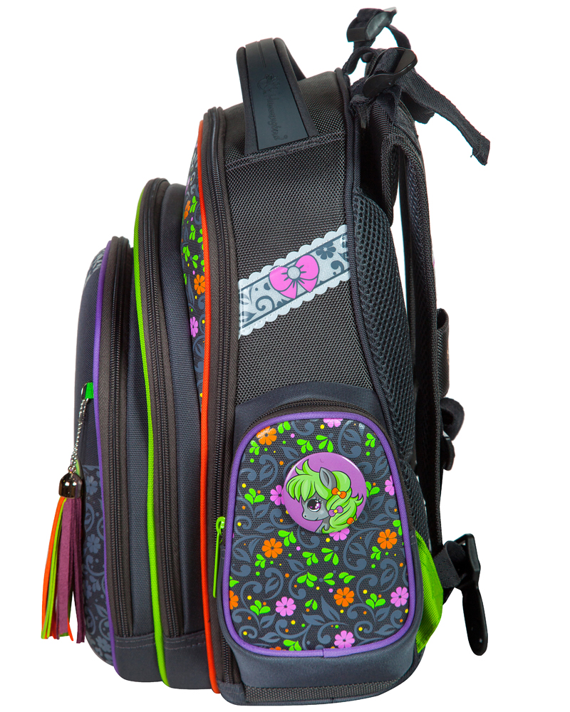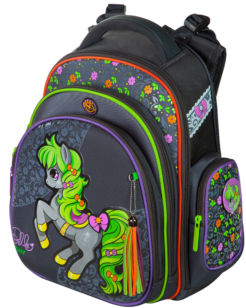 - три больших отделения на молниях. В основном, самом большом отделении расположены жесткие перемычки- вставки, для комфортного размещения тетрадей или учебников. В переднем отделении предусмотрен органайзер с карманом для мобильного телефона, сетчатым карманом для мелочей, отделениями для ручек и карандашей, подвеской для ключей;