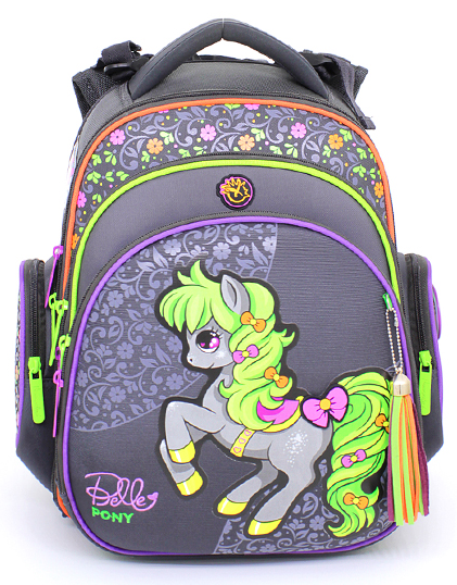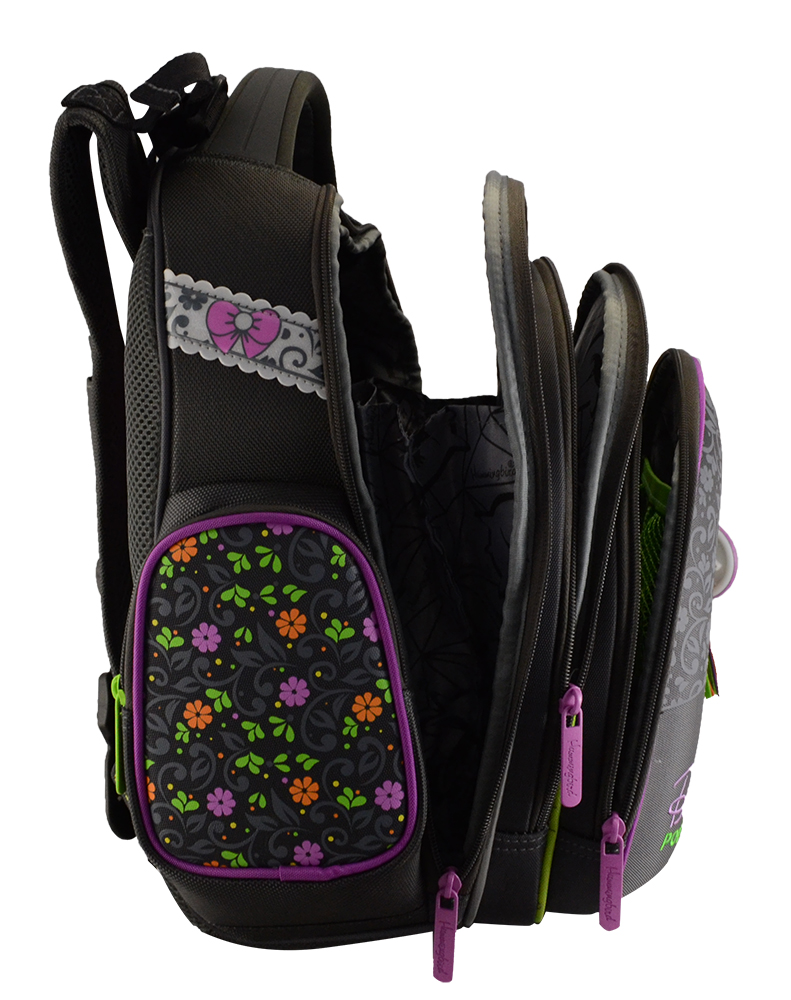 - три больших отделения на молниях. В основном, самом большом отделении расположены жесткие перемычки- вставки, для комфортного размещения тетрадей или учебников. В переднем отделении предусмотрен органайзер с карманом для мобильного телефона, сетчатым карманом для мелочей, отделениями для ручек и карандашей, подвеской для ключей;
