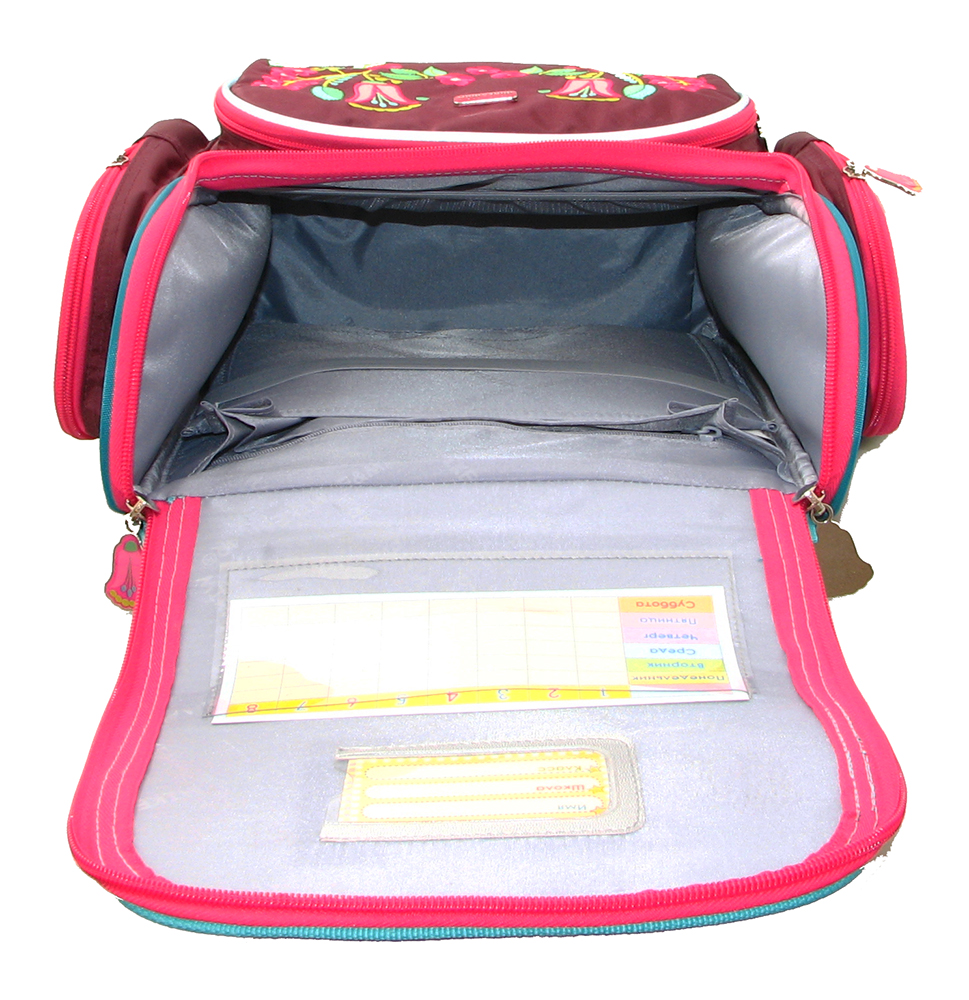 Внутреннее пространство ранца содержит большое основное отделение, два «плавающих отделения», которые фиксируются резинкой и отделение с вентилируемой сеточкой. Под верхней крышкой ранца расположено пластиковое окошко со сменным расписанием уроков и бейджик.
