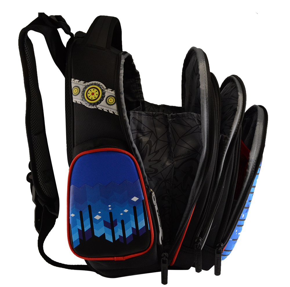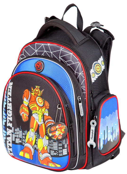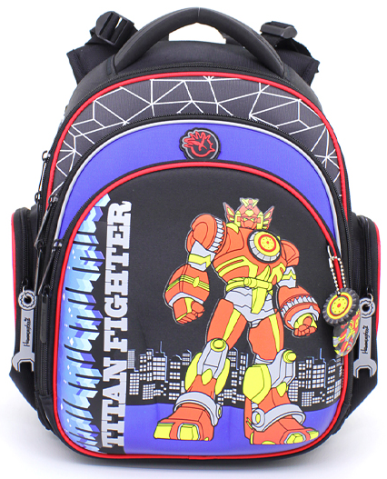 - три больших отделения на молниях. В основном, самом большом отделении расположены жесткие перемычки- вставки, для комфортного размещения тетрадей или учебников. В переднем отделении предусмотрен органайзер с карманом для мобильного телефона, сетчатым карманом для мелочей, отделениями для ручек и карандашей, подвеской для ключей;