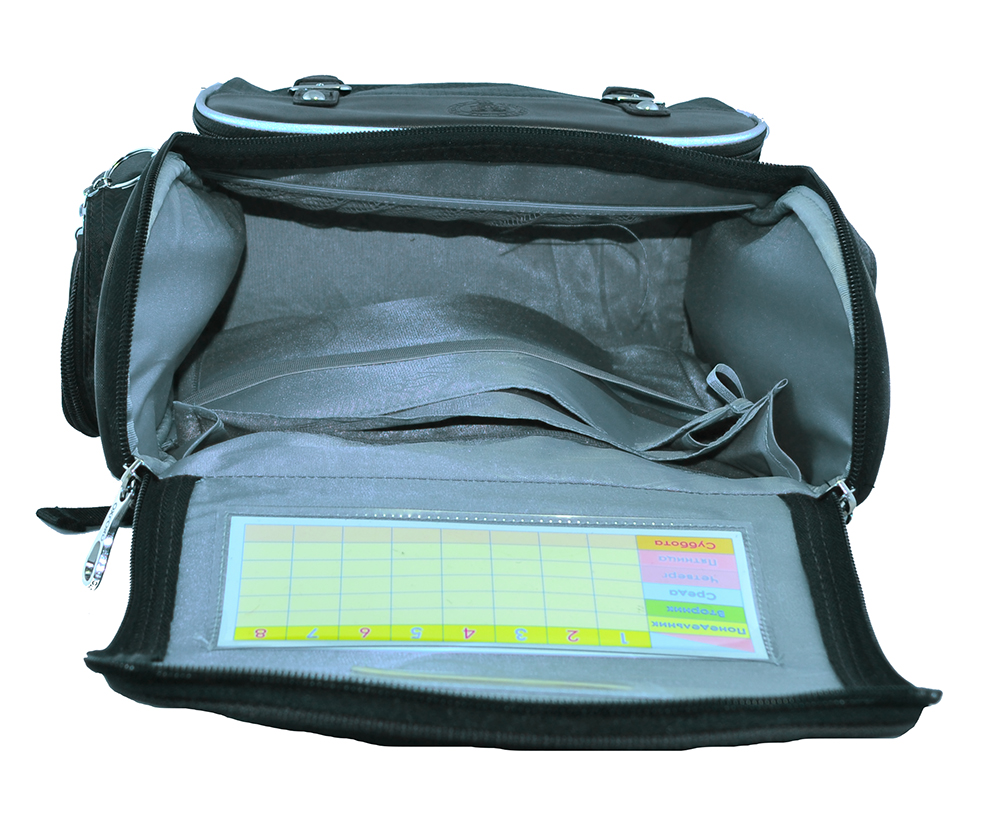 - Внутреннее пространство рюкзака содержит большое основное отделение, два «плавающих отделения», которые фиксируются резинкой и отделение с вентилируемой сеточкой. Под верхней крышкой ранца расположено пластиковое окошко со сменным расписанием уроков и бейджик.