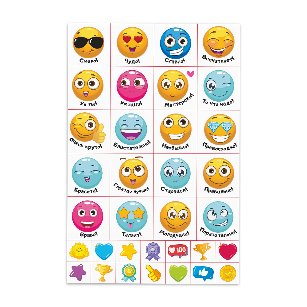 Огромное значение для успешного обучения детей дошкольного возраста и первоклассников, имеет положительная оценка выполненных им заданий. Отметить успехи ребенка в учебной, спортивной или творческой деятельности поможет набор красочных наклеек «Смайлики» с поощрительными подписями. Дополнительно прилагаются маленькие поощрительные наклейки в виде сердечек, оценок, медалей и аплодисментов.