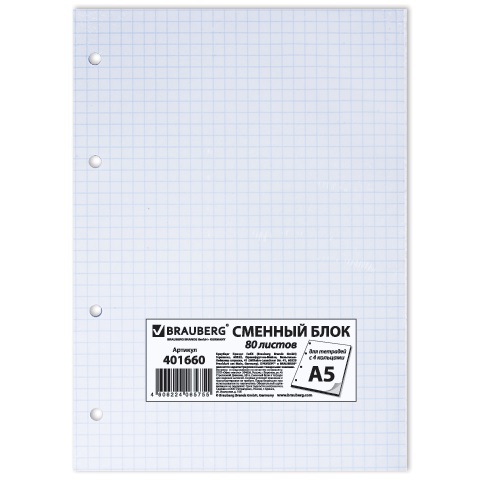 Блок сменный А5 80 листов, блок-клетка BRAUBERG белый