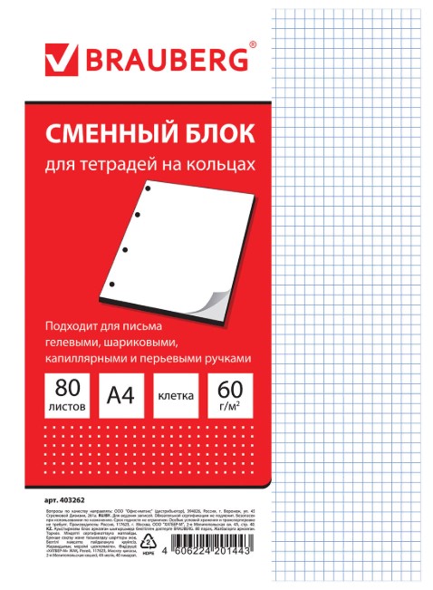 Сменный блок А4 клетка, 80 листов к тетради на кольцах, белый Brauberg