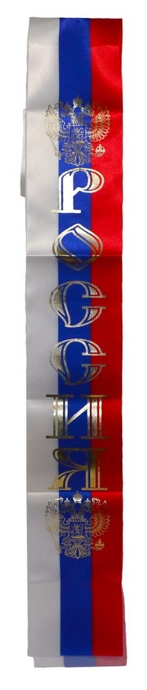 Эта праздничная лента в цветах флага России станет отличным украшением на праздники. Золотыми буквами на ленту нанесена надпись "Россия" и герб Российской Федерации.