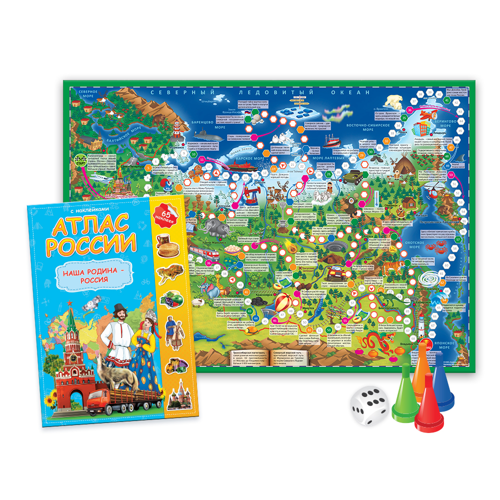 Игровое поле на основе карты России адаптировано для детей художниками и редакторами Издательства. Бросайте кубик, чтобы определить, по какому маршруту следовать: по Транссибирской магистрали или по Северному морскому пути. В ходе игры произойдет знакомство даже с самыми отдаленными уголками Родины от ее западных границ до восточных.