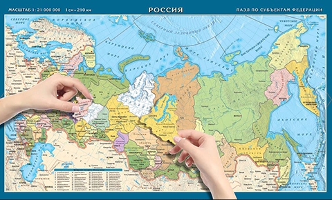 Пазл состоит из 90 элементов разных форм и размеров. Каждый элемент – это один из субъектов Российской Федерации. Найдите для всех элементов свое место, правильно определите границы регионов, и перед вами предстанет самая подробная карта России.