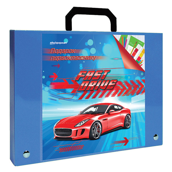 Портфель "Подарок первокласснику" имеет ручку и застежки на 2 кнопки и рисунок с изображением авто.