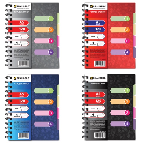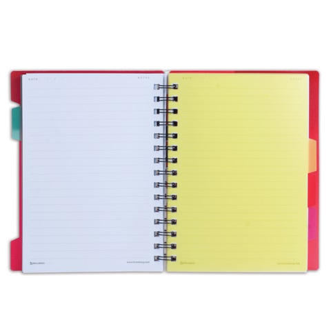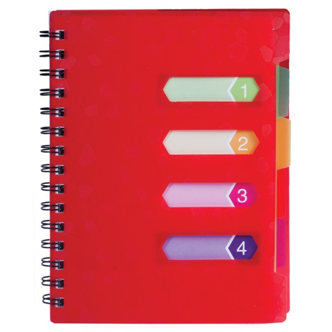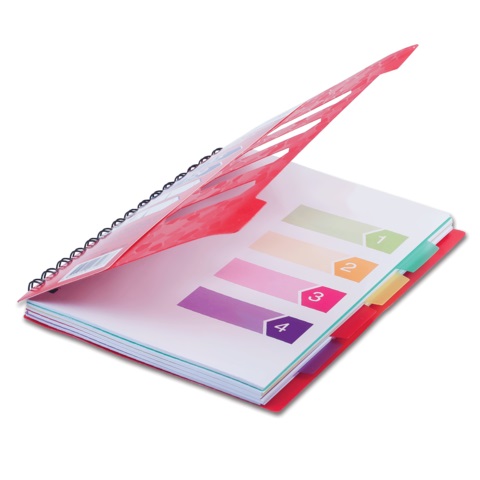 Оригинальная тетрадь на гребне с обложкой из цветного пластика. Удобная вырубка позволяет делать подписи на обложке, а четыре разноцветных разделителя облегчают поиск нужной информации.