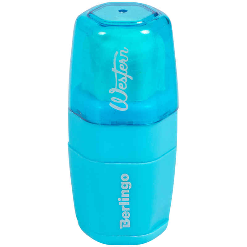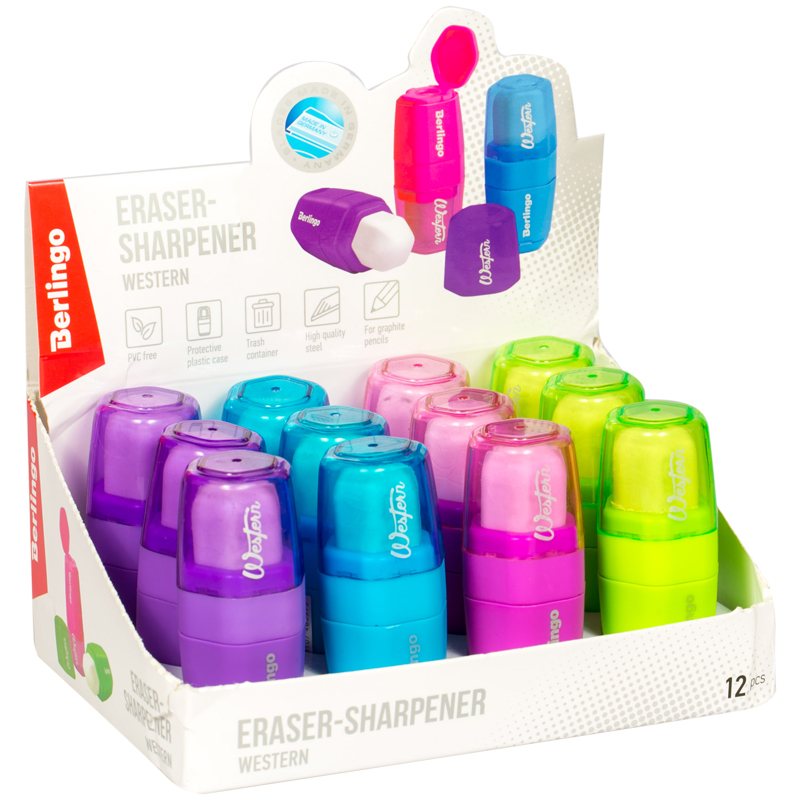Точилка пластиковая с ластиком Berlingo "Western", 1 отверстие, контейнер, ассорти, 253693