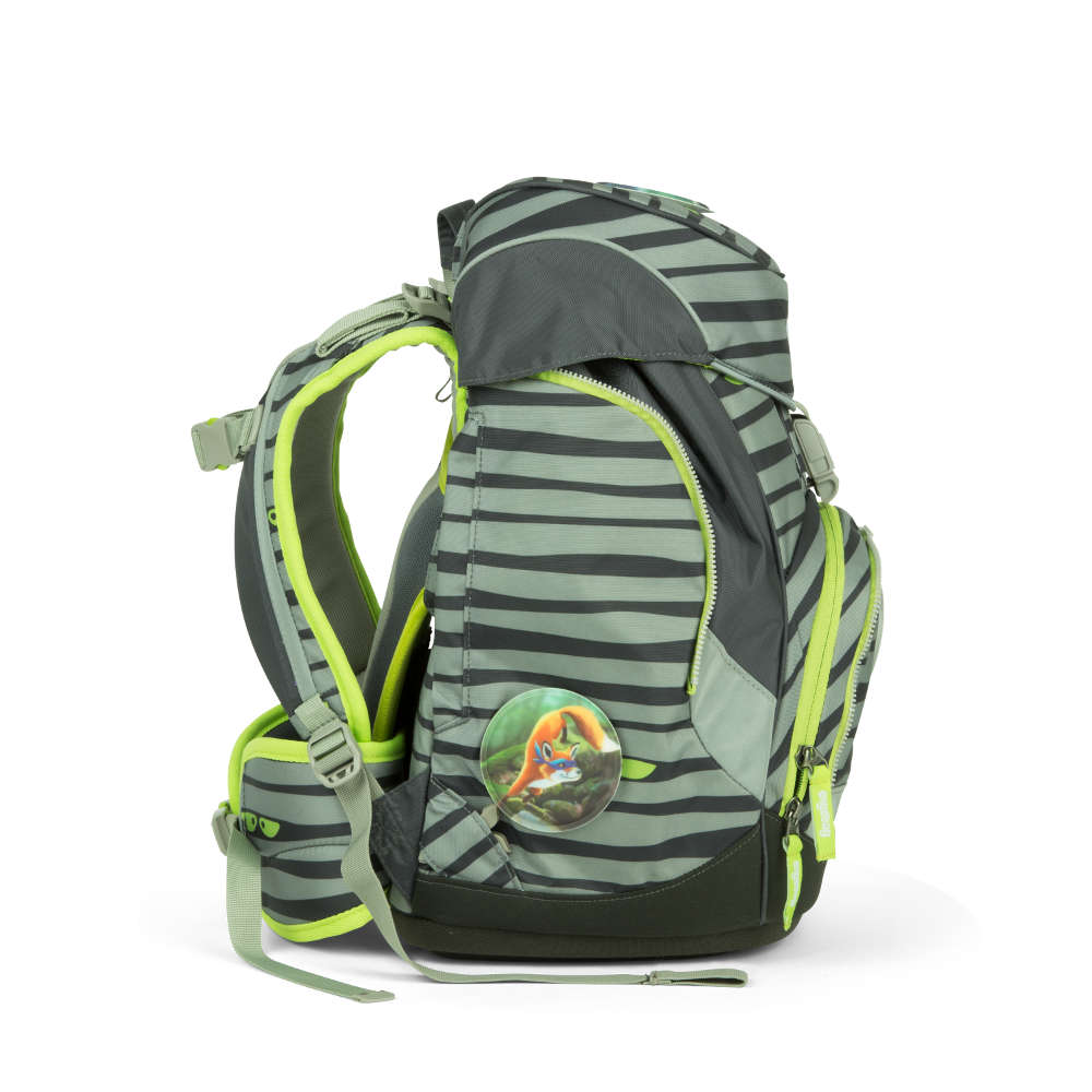 Рюкзак украшен стикерами, которые крепятся на липучках. К рюкзаку можно легко присоединить небольшой рюкзак для спортивной формы. В комплекте два пенала на молнии и пластиковая папка. В пенале с наполнением есть цветные карандаши, ластик, точилка и линейка. Рюкзак предназначен на рост ребенка от 110 до 150 см.