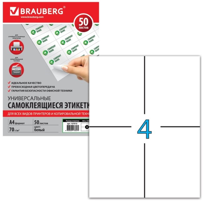 Этикетка самоклеящаяся 105*148 мм, 4 этикетки, 50 листов белая, 70 г/м2, BRAUBERG