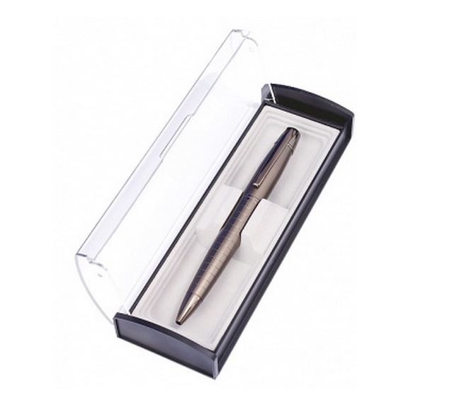 Ручка шариковая подарочная с поворотным механизмом в металлическом корпусе серого цвета. Ручка поставляется в подарочном пластиковом футляре, упакована в картонную коробочку на европодвесе.