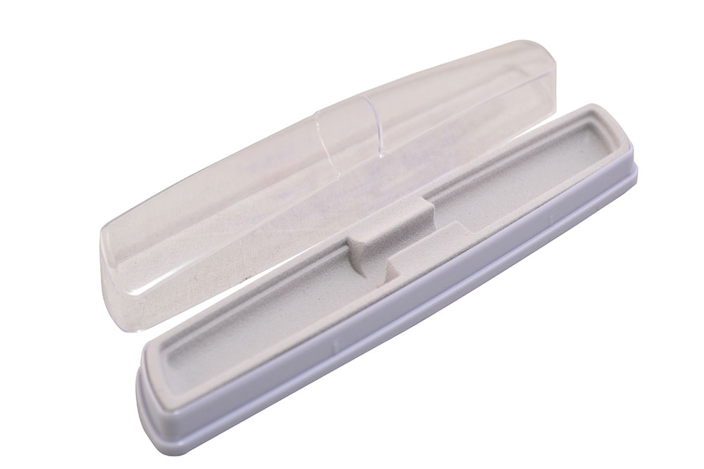Пластиковый футляр для ручки. Внутри пластиковая подкладка с бархатным покрытием, на которой есть специальная ниша для фиксации ручки.