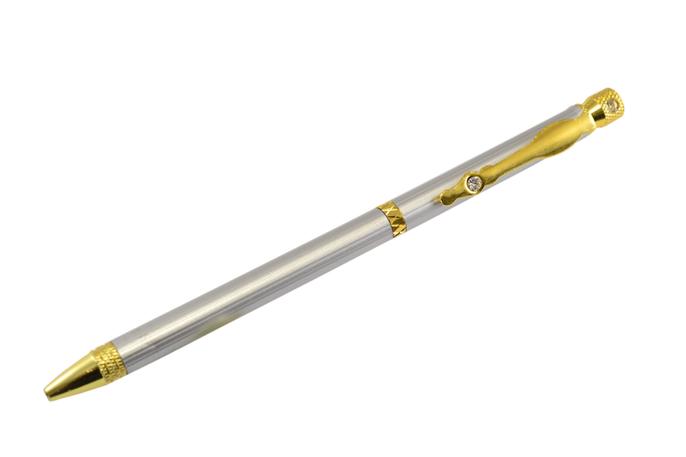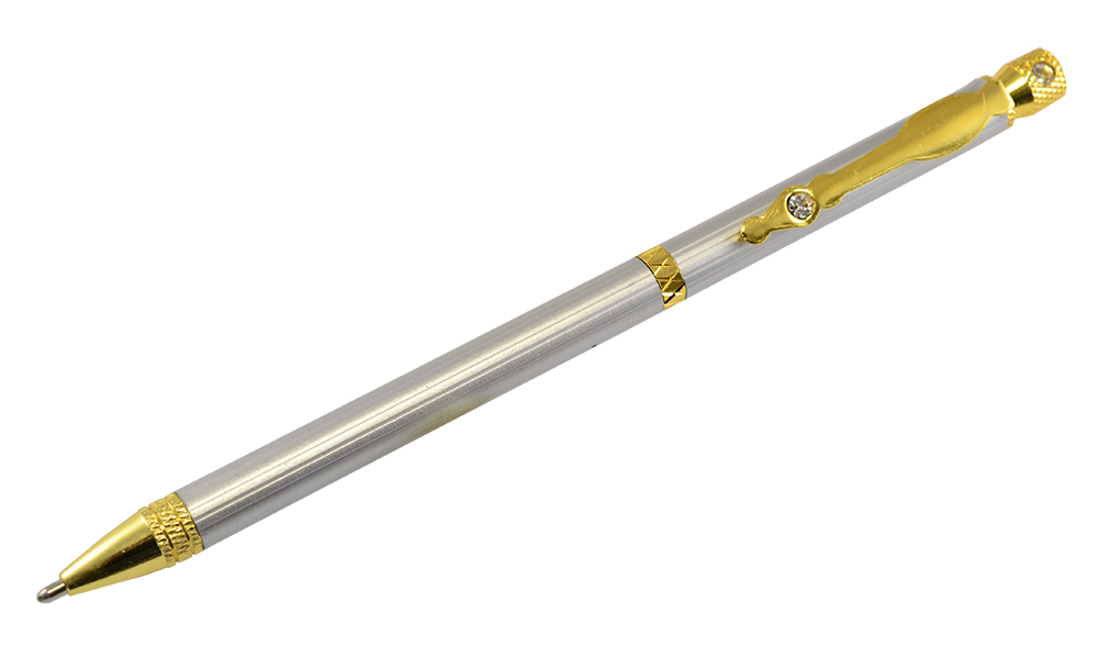 Автоматическая шариковая ручка с поворотным механизмом, в металлическом корпусе (серебро с золотом), корпус и клип ручки украшены стразами. Цвет чернил - синий.