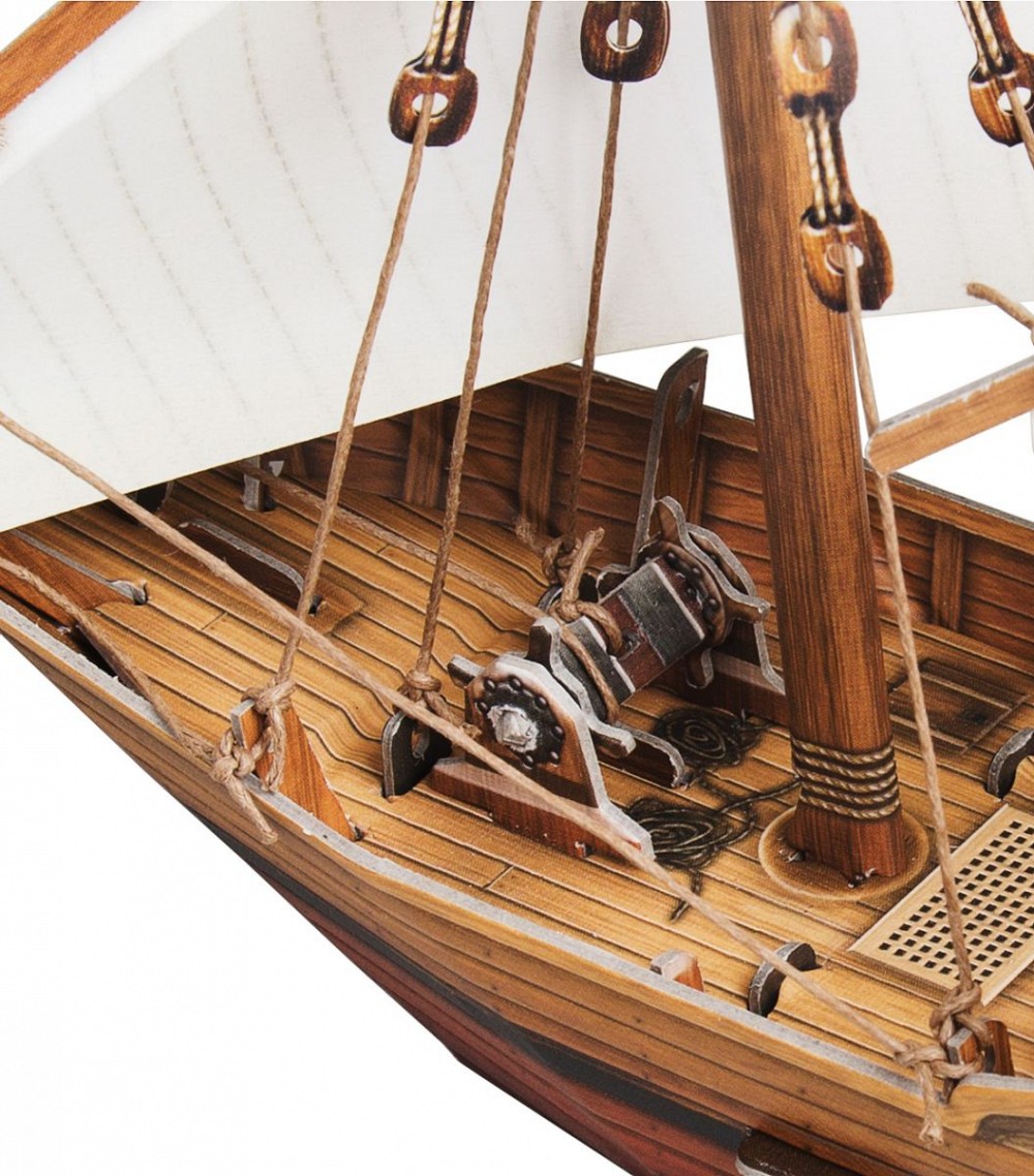 Основной материал модели - прочный "переплетный" картон толщиной 1,5 мм. Работа с деталями подробно нарисована в инструкции - весь процесс сборки показан в картинках. При сборке учитывайте, что сторона детали с объемной текстурой должна быть видна снаружи, а гладкая сторона детали обращена внутрь корпуса корабля. При сборке вам встретятся и другие материалы, например, паруса выполнены из гибкого тонкого картона. Материал для вязки снастей также включен в набор. Они добавят вашей модели сходства с настоящим кораблем. Толщина и материал нитей тщательно подобраны и удобны для завязывания мелких узелков. Схема вязки каждого узла есть в инструкции.