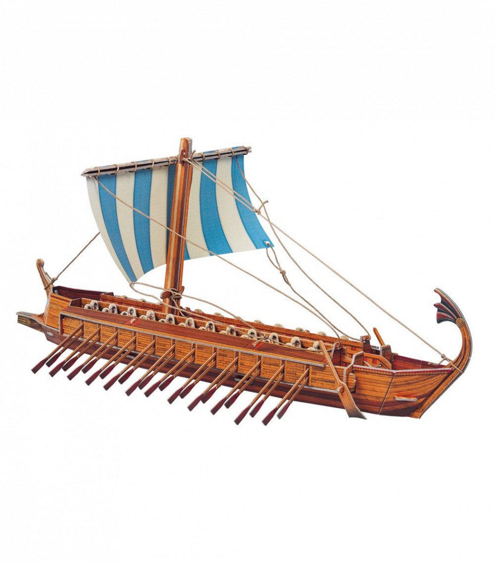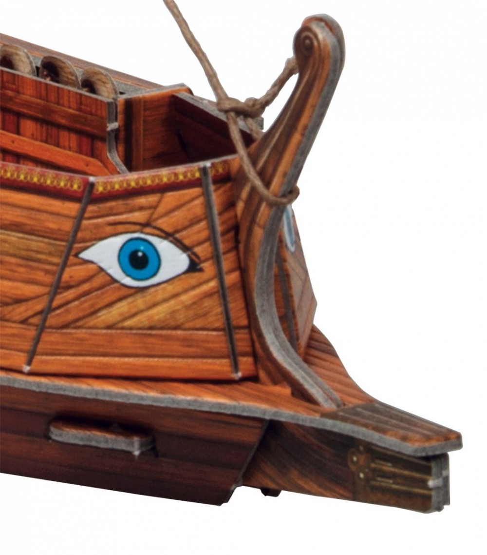 Работа с деталями подробно нарисована в инструкции, которая весь процесс сборки показывает в картинках. Основной материал модели - прочный "переплетный" картон толщиной 1,5 мм. При сборке учитывайте, что сторона детали с объемной текстурой должна быть видна снаружи, а гладкая сторона детали обращена внутрь корпуса модели. Часть деталей выполнена из картона толщиной 1 мм. Такие детали сгибаются только в одну сторону. При сборке вам встретятся и другие материалы, например, паруса выполнены из гибкого картона. Тонкие веревочки для вязки снастей также включены в набор. Они удерживают мачту и позволяют управлять парусом, как на настоящей биреме. Материал веревочек тщательно подобран, а их толщина удобна для завязывания мелких узелков. Схема вязки каждого узла есть в инструкции.