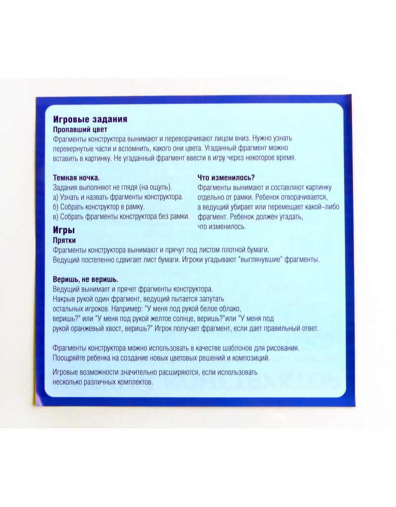 Самая простая игра для самых маленьких. Помогает развить у ребенка чувство формы, размера, цвета и симметрии. В упаковку с игрой вложена инструкция с методическими рекомендациями, игровыми заданиями.