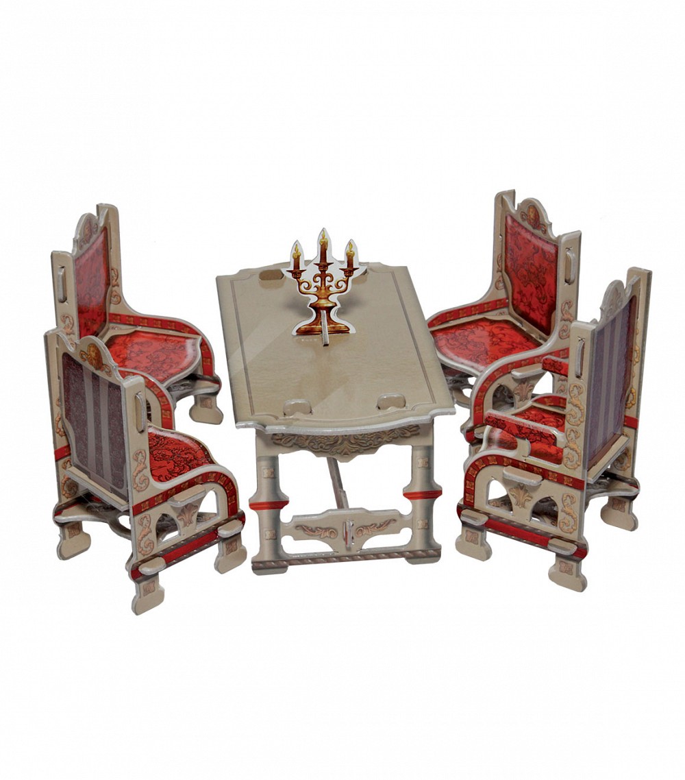 Мебель доступна в двух вариантах - в светлом и темном исполнении. В комплект, кроме обеденного стола, входят три стула и кресло. Кресло отличается высокой спинкой. Интересное дополнение - подсвечник. В наборе есть все для самостоятельной сборки столовой. Нет необходимости при подготовке вырезать детали. Детали соединяются друг с другом без клея. После сборки набор можно использовать для игры. Конструкция достаточно прочна и стабильна. Набор отличается простой и понятной сборкой. Его можно смело рекомендовать детям, которые не имеют опыта сборки наших игрушек.