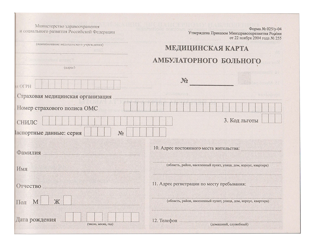 Стандартная медицинская карта амбулаторного больного на 100 листов.