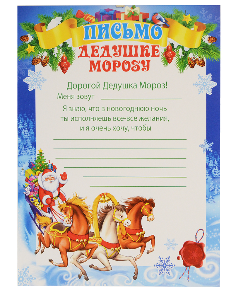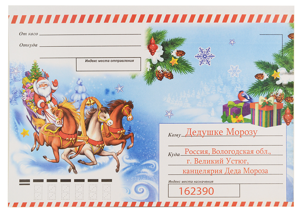 Письмо Дедушке Морозу формата А4 с обращением к новогоднему кудеснику! На конверте уже есть адрес назначения, Вам останется только написать свой адрес, чтобы Дедушка Мороз знал, куда отправлять подарок!
