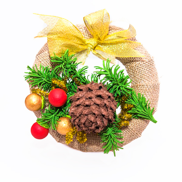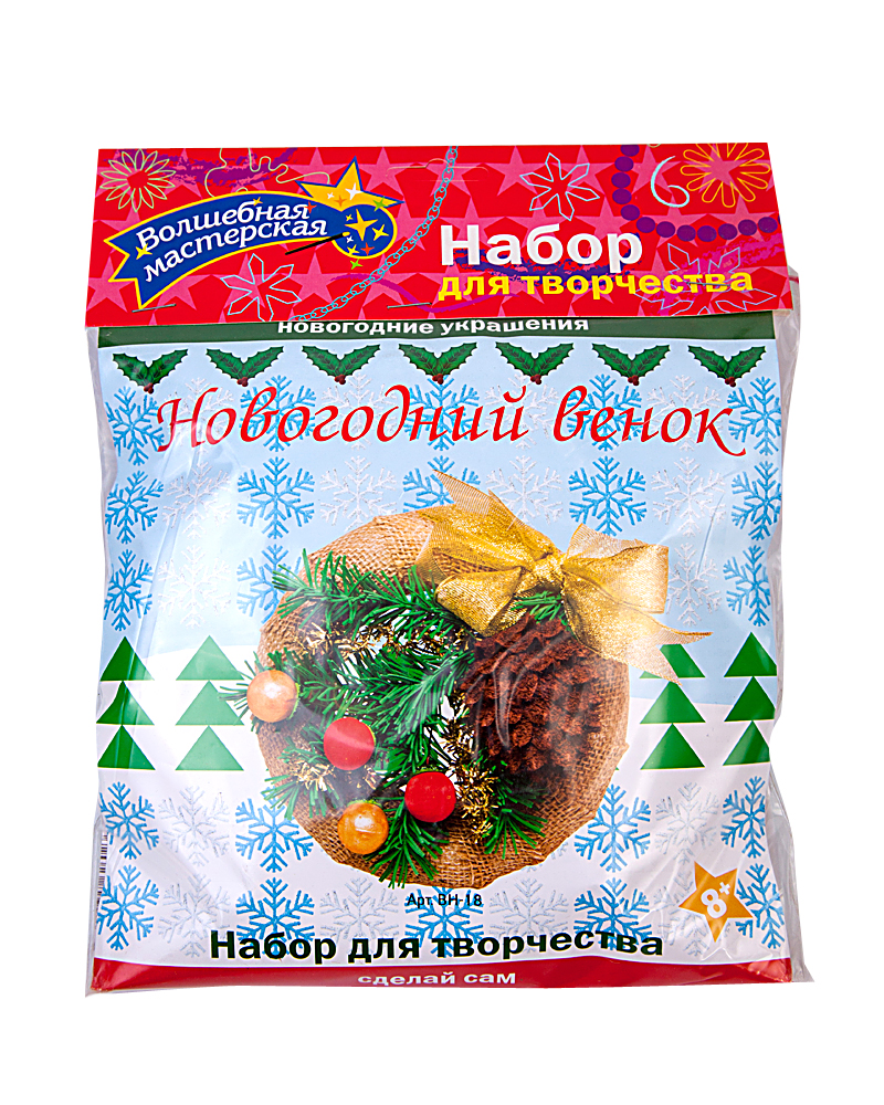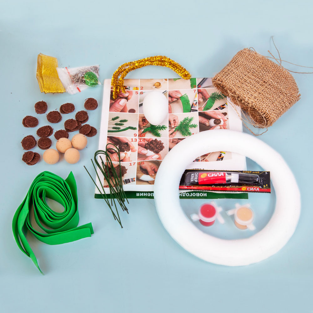 - В наборе: пенопластовые шары диаметром 2 см и венок, гвоздики-булавки, разноцветные листы фоамиран и готовая вырубка, клей, зубочистки, проволока, акриловая краска, мишура, мешковина, лента, инструкция с пошаговым описанием и фото