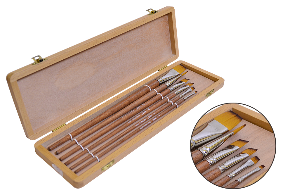 Набор кистей синтетика 6 шт., плоские в деревянном футляре