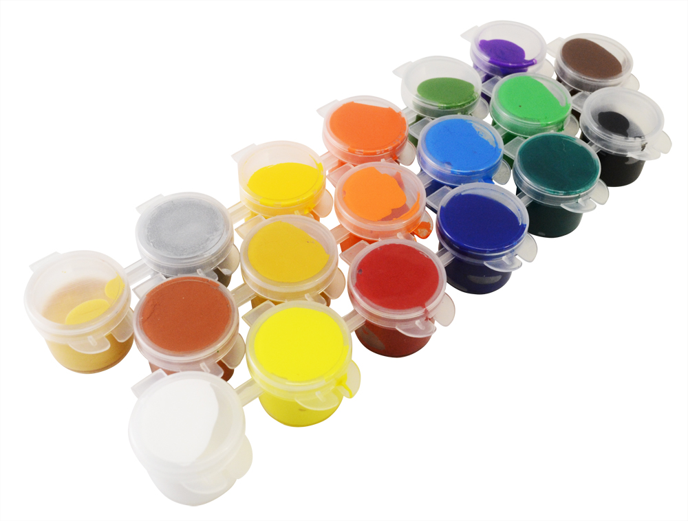 Акриловые краски в упаковке 18 цветов по 5 мл. Акриловые краски подходят почти для любой поверхности, а их использование напоминает рисование акварелью. Краски быстро сохнут, обладают яркими насыщенными цветами, после высыхания полностью устойчивы к воде.