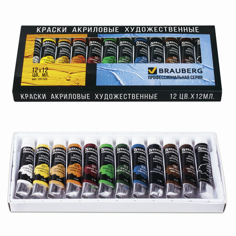 Краски акриловые художественные BRAUBERG 12 цветов по 12 мл, профессиональная серия в тубах