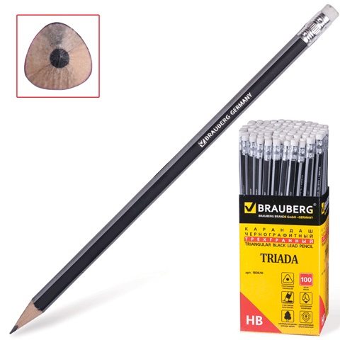 Карандаш чернографитный, НВ, черно-серебристый BRAUBERG Triada, заточенный, ластик 10 штук