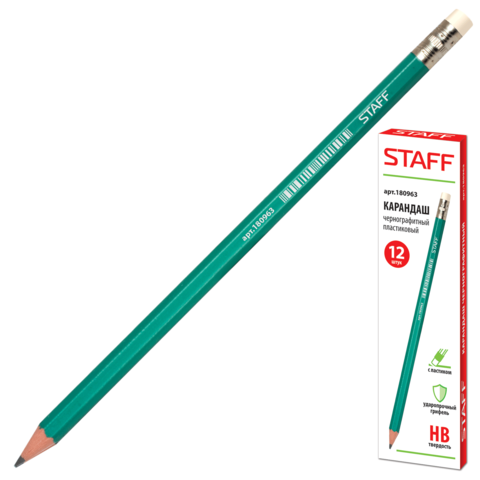 Карандаш чернографитный HB STAFF пластиковый, с ластиком 12 штук