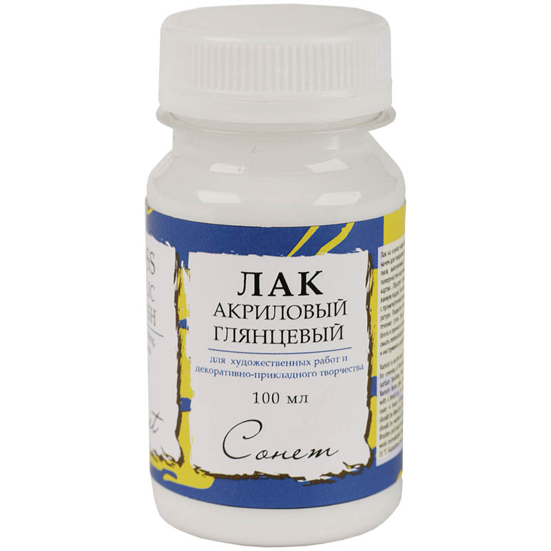 Лак акриловый, глянцевый, 100 мл. На основе водной акриловой дисперсии. Предназначен для завершающего покрытия работ, выполненных акриловыми красками, а также для использования в декоративных техниках (декупаж, кракелюр, роспись по различным поверхностям). Создавая на поверхности прочную пленку, акриловый лак «Сонет» защищает работу от воздействий внешней среды. Придает поверхности изделия законченный вид с глянцевым эффектом