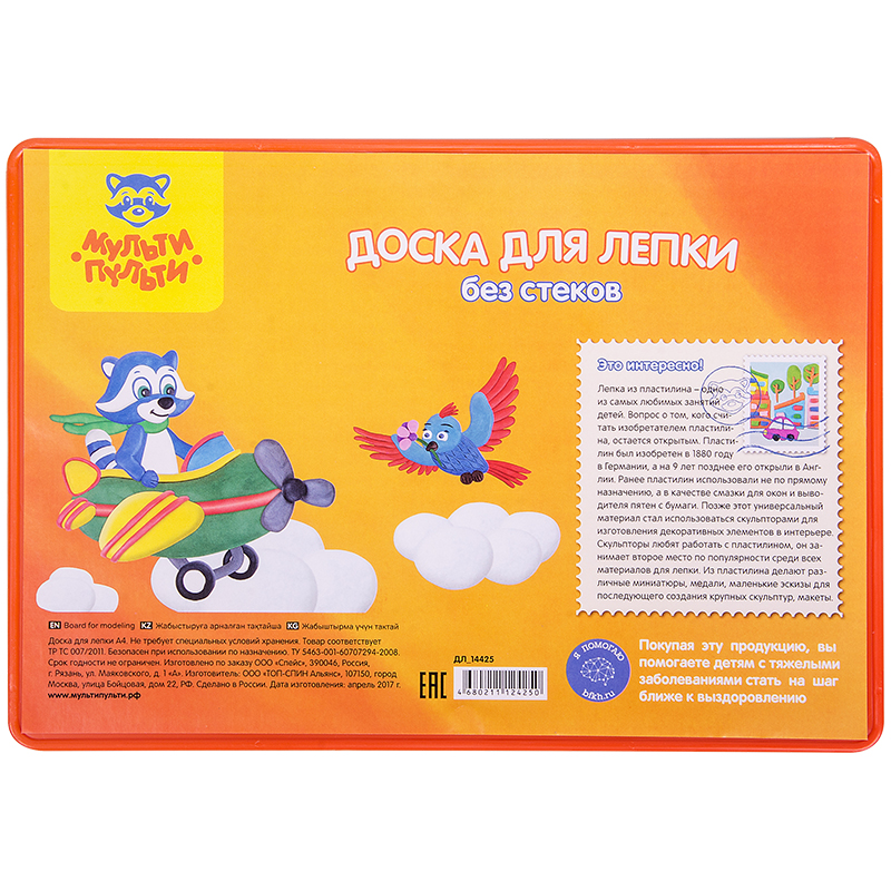 Доска формата А4 предназначена для лепки из пластилина. Изготовлена из жесткого прочного пластика, устойчивого к царапинам. Имеет закругленные углы для безопасности маленького скульптора. Гладкая поверхность. Упакована в термоусадочную пленку с ярким вкладышем.