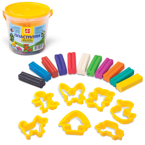 Набор для лепки и моделирования. 11 брусков пластилина различного цвета и пластиковые формочки помещены в пластмассовое ведро. Пластилин имеет яркие сочные цвета, не прилипает к рукам и хорошо смешивается между собой. Безопасно при использовании по назначению.