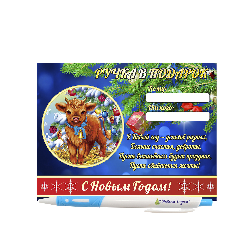 В наборе с ручкой открытка из плотной бумаги с поздравлением в стихотворной форме и полями для внесения личных данных.