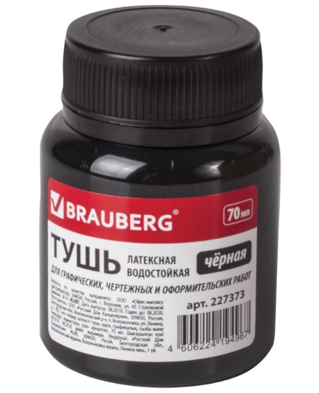 Тушь чертежная черная, 70 мл, водостойкая, латексная BRAUBERG
