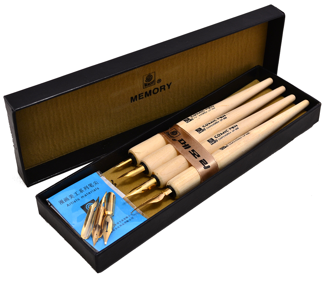 Набор из четырех позолоченых плакатных перьев с деревянными держателями + четыре запасных пера.