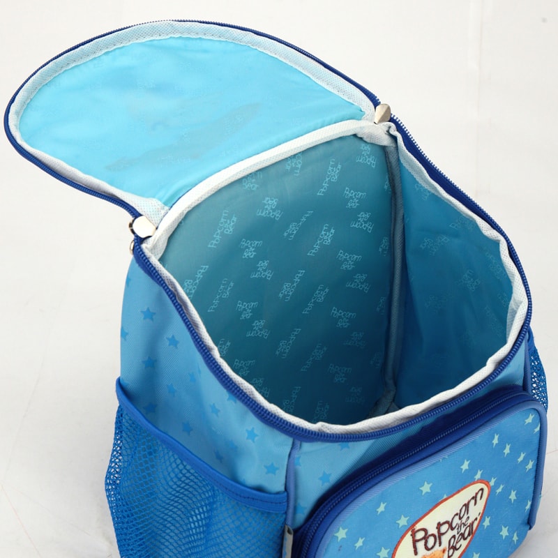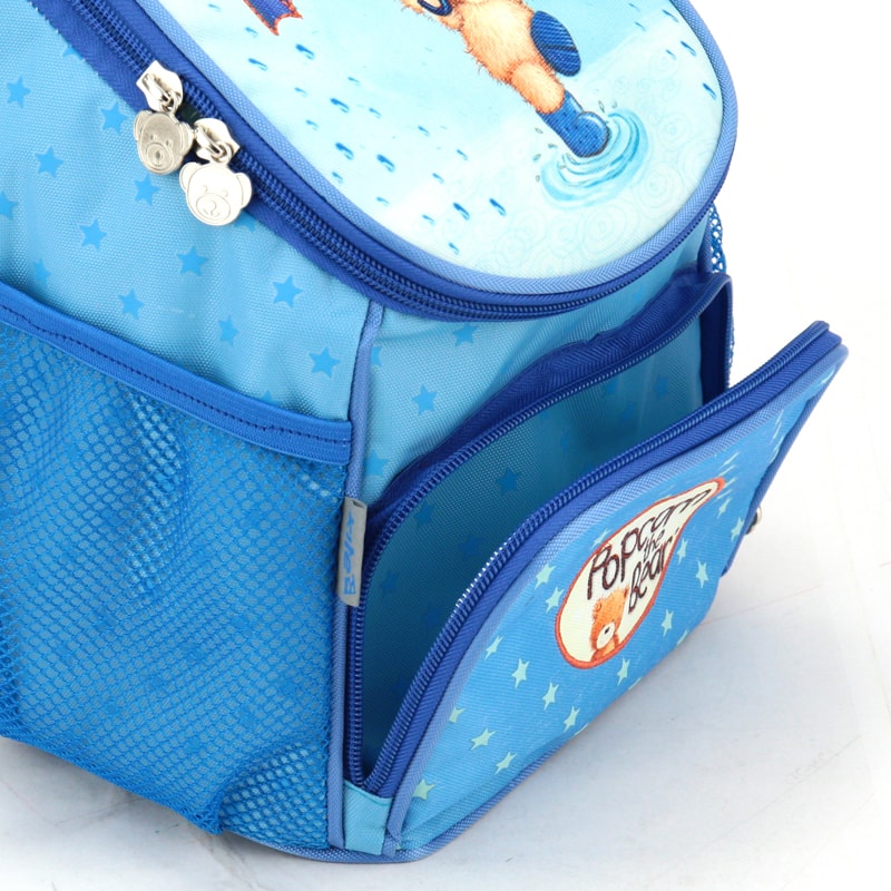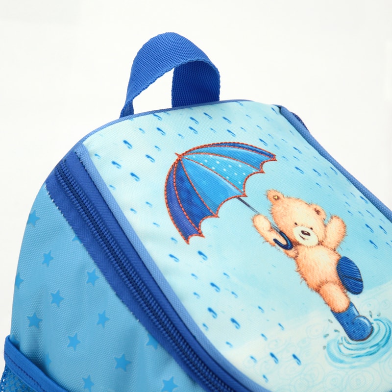 Рюкзак для девочек дошкольного возраста выполнен из прочного полиэстера голубого цвета с изображением мишки.