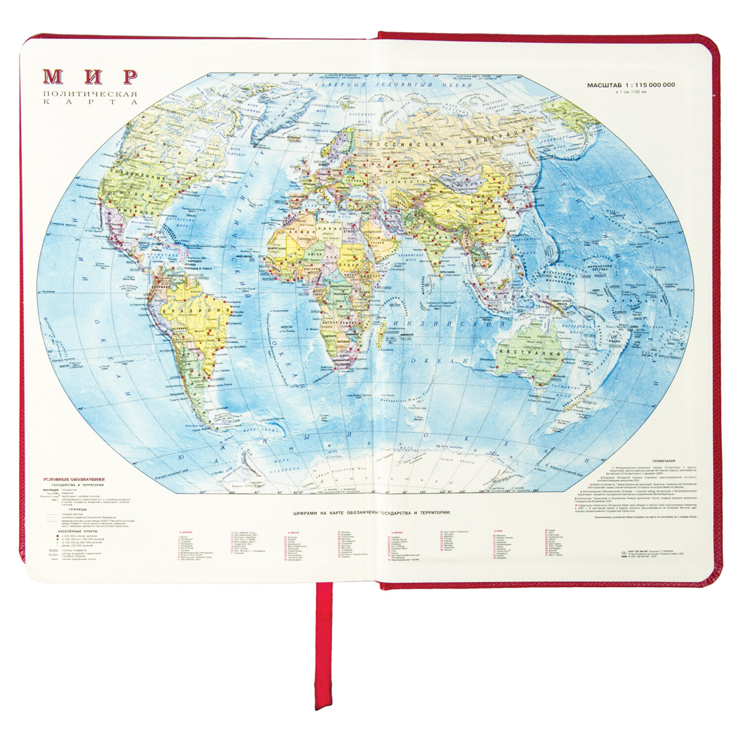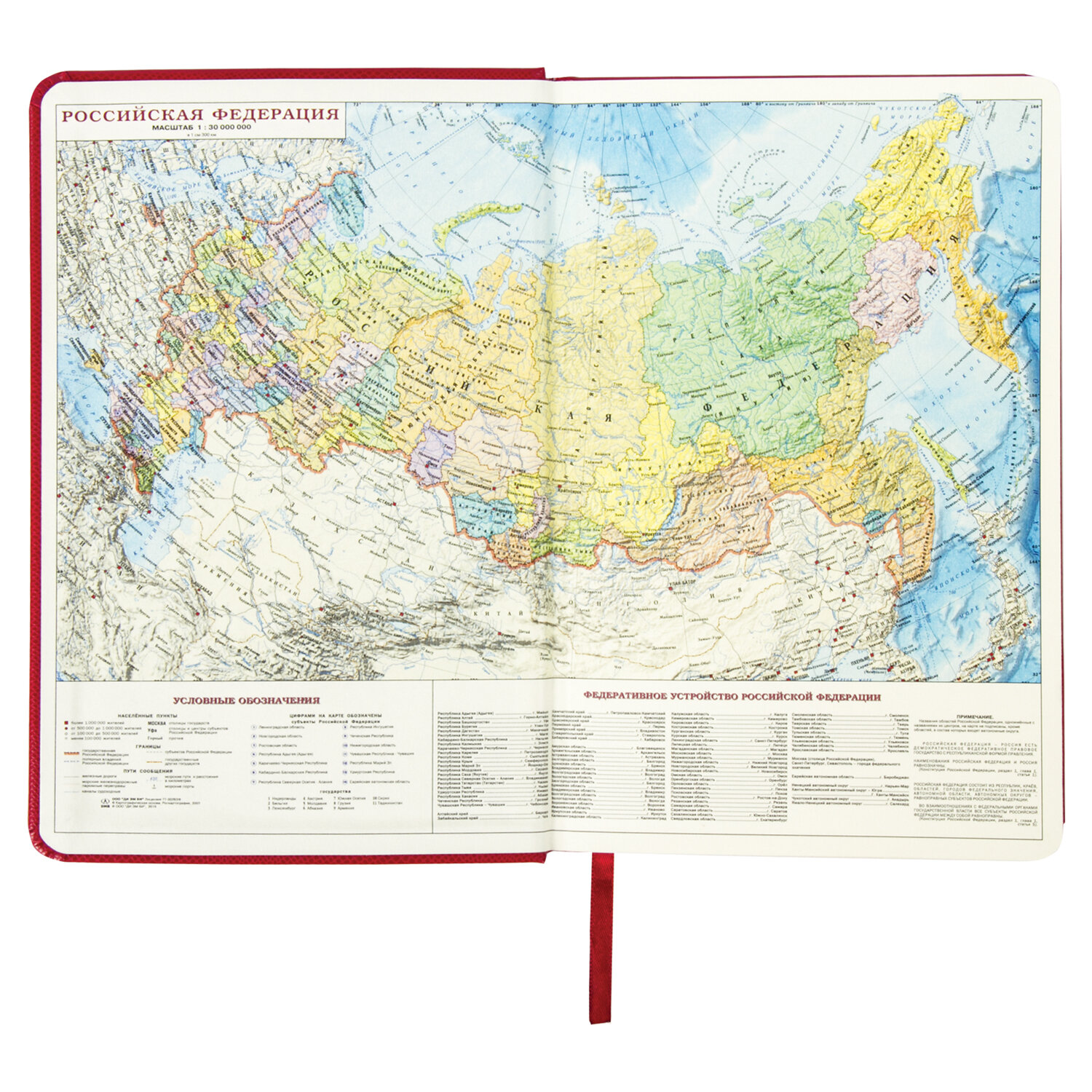 Подходит для горячего тиснения. Срез ежедневника фольгинирован золотой фольгой, что придает ему особый шарм. Форзац ежедневника представлен картами мира и России. Дополнением является закладка-ляссе, с помощью которой при необходимости можно быстро открыть ежедневник на нужной странице. Помимо прочего ежедневник снабжен обширным справочным материалом.