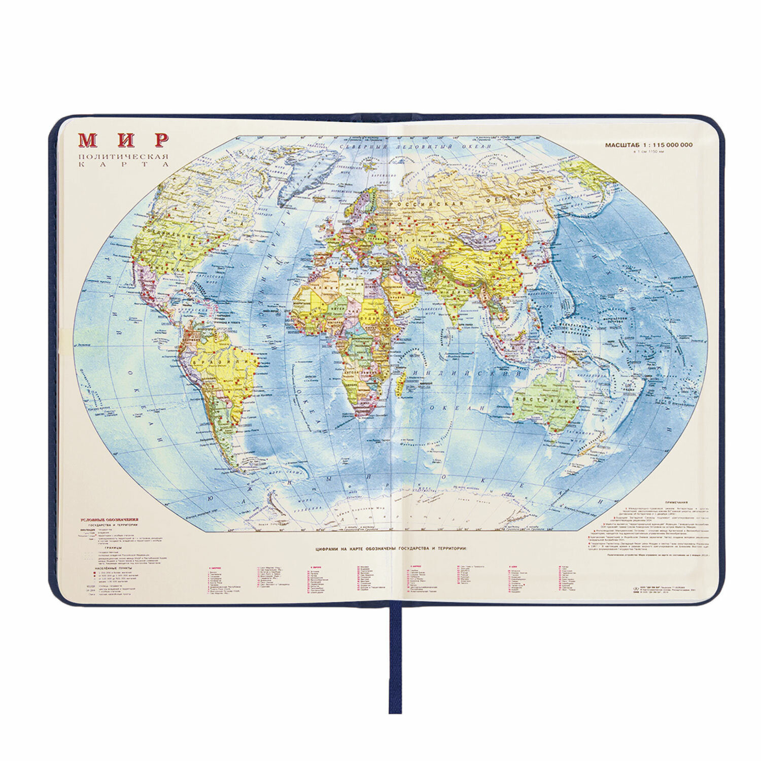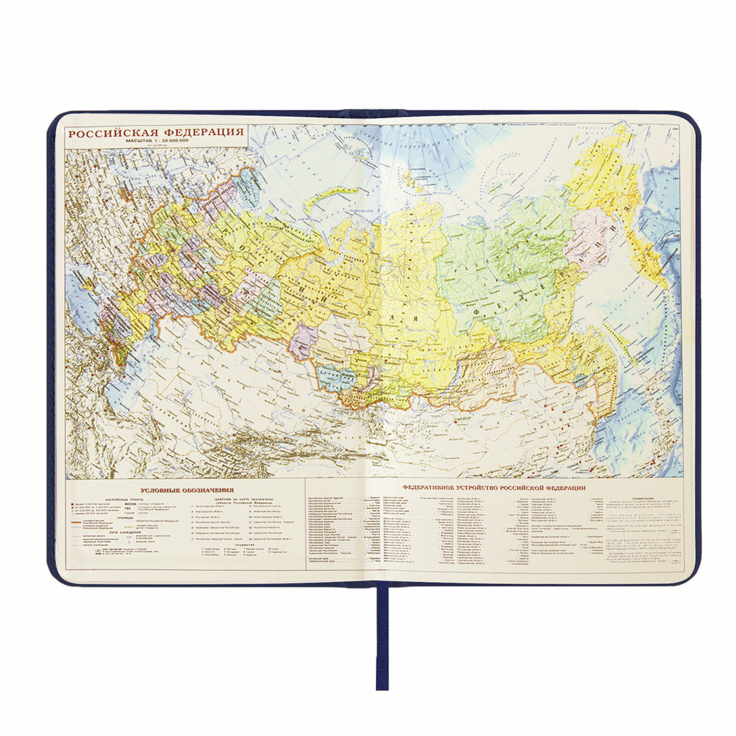 Материал обложки подходит для горячего тиснения. Форзац ежедневника представлен картами мира и России. Дополнением является закладка-ляссе, с помощью которой при необходимости можно быстро открыть ежедневник на нужной странице. Помимо прочего ежедневник снабжен обширным справочным материалом.