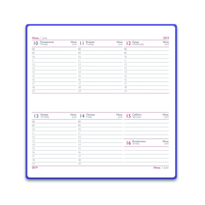 Удобный датированный еженедельник-органайзер в твердом переплете. Данный еженедельник имеет обложку из искусственной кожи "Наппа", на которой тиснением нанесена надпись "2019". К особенностям можно отнести горизонтальную ориентацию и функциональную закладку-ляссе.