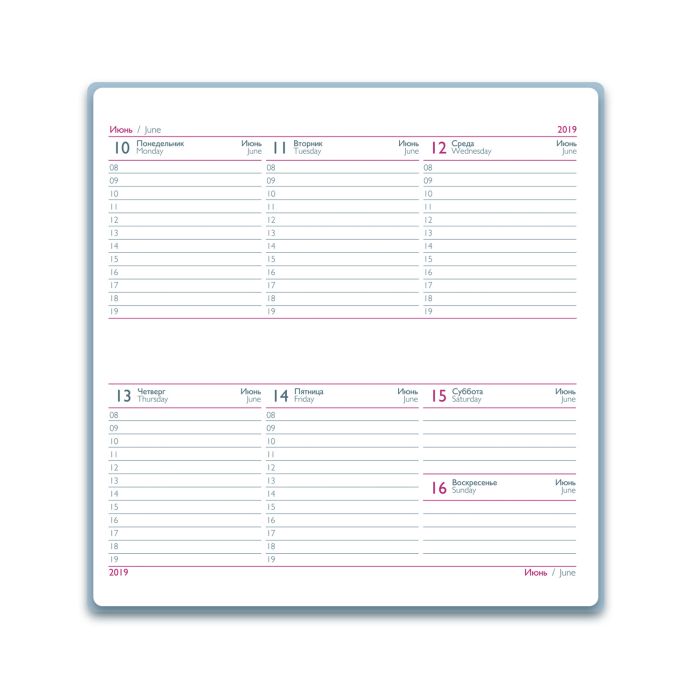 Удобный датированный еженедельник-органайзер в твердом переплете. Данный еженедельник имеет обложку из искусственной кожи "Наппа", на которой тиснением нанесена надпись "2019". К особенностям можно отнести горизонтальную ориентацию и функциональную закладку-ляссе.