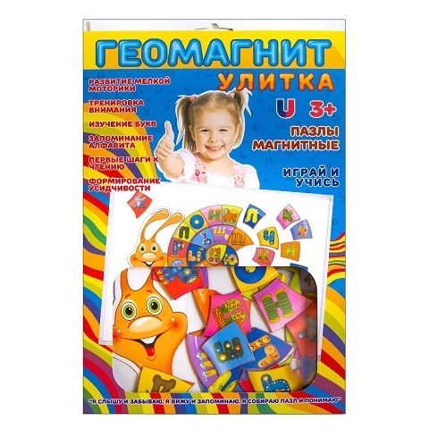 Это самый веселый алфавит на свете! И не удивительно, ведь каждая буква в нем изображена в виде знакомого детям предмета. А весь алфавит целиком – это забавная разноцветная улитка. Предложите ребенку собрать ее из разрозненных элементов, и он легко выучит буквы и научится составлять из них слова. Магнитные пазлы можно собирать как на столе, так и на любой металлической поверхности, например, холодильнике. Яркие элементы и веселые картинки сделают игру интересной, помогут увлечь ребенка и быстрее развить полезные навыки. Занятия с пазлами улучшают мелкую моторику, внимательность и образное мышление. Игры на освоение азбуки неизменно пользуются высоким спросом у покупателей.