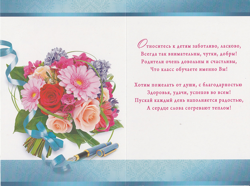 Красочная открытка с поздравлением в стихах. Красивый подарок ко Дню учителя, выпускному или к другим торжествам! Поздравление уже напечатано на внутренней стороне, Вам остается только подписать ее и вручить.