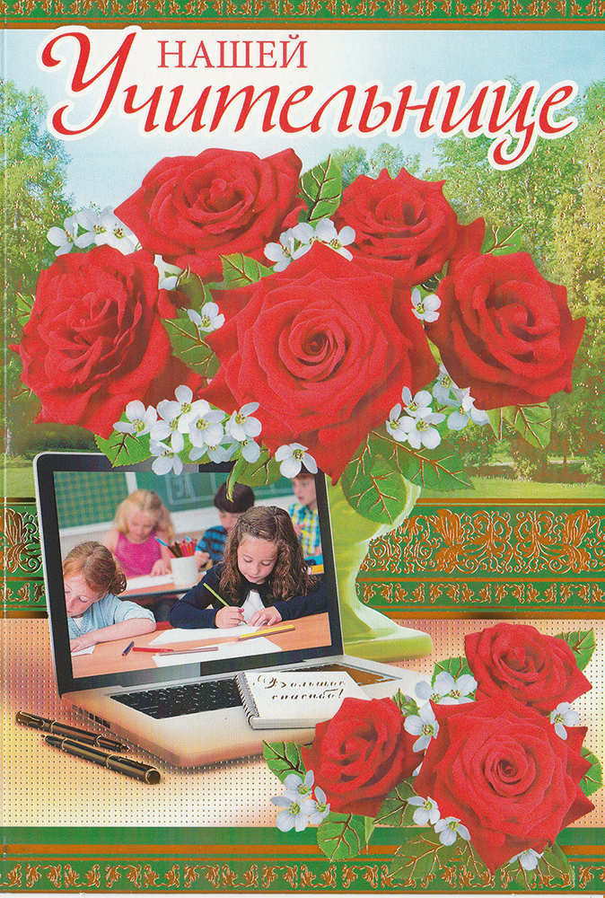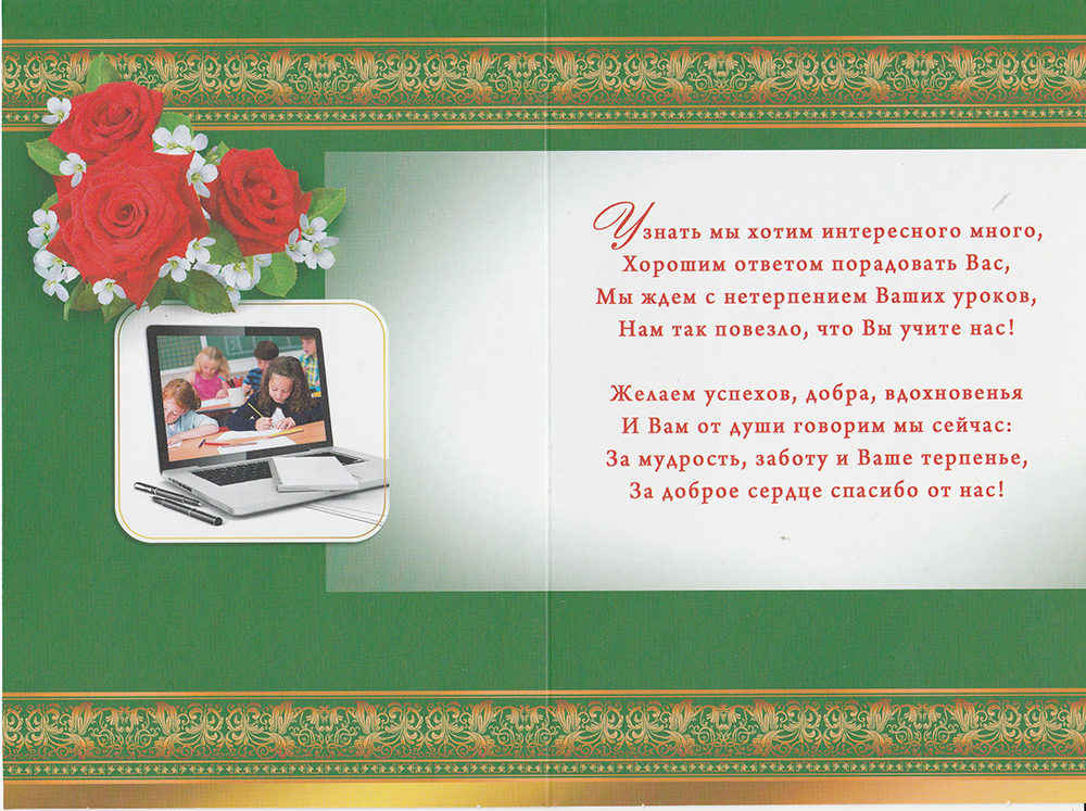 Красочная открытка с поздравлением в стихах. Красивый подарок ко Дню учителя, выпускному или к другим торжествам! Поздравление уже напечатано на внутренней стороне, Вам остается только подписать ее и вручить.