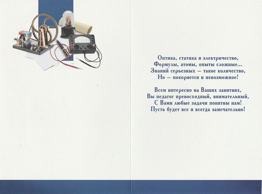 Красочная открытка с поздравлением в стихах. Красивый подарок ко Дню учителя, выпускному или к другим торжествам! Поздравление уже напечатано на внутренней стороне, Вам остается только подписать ее и вручить.